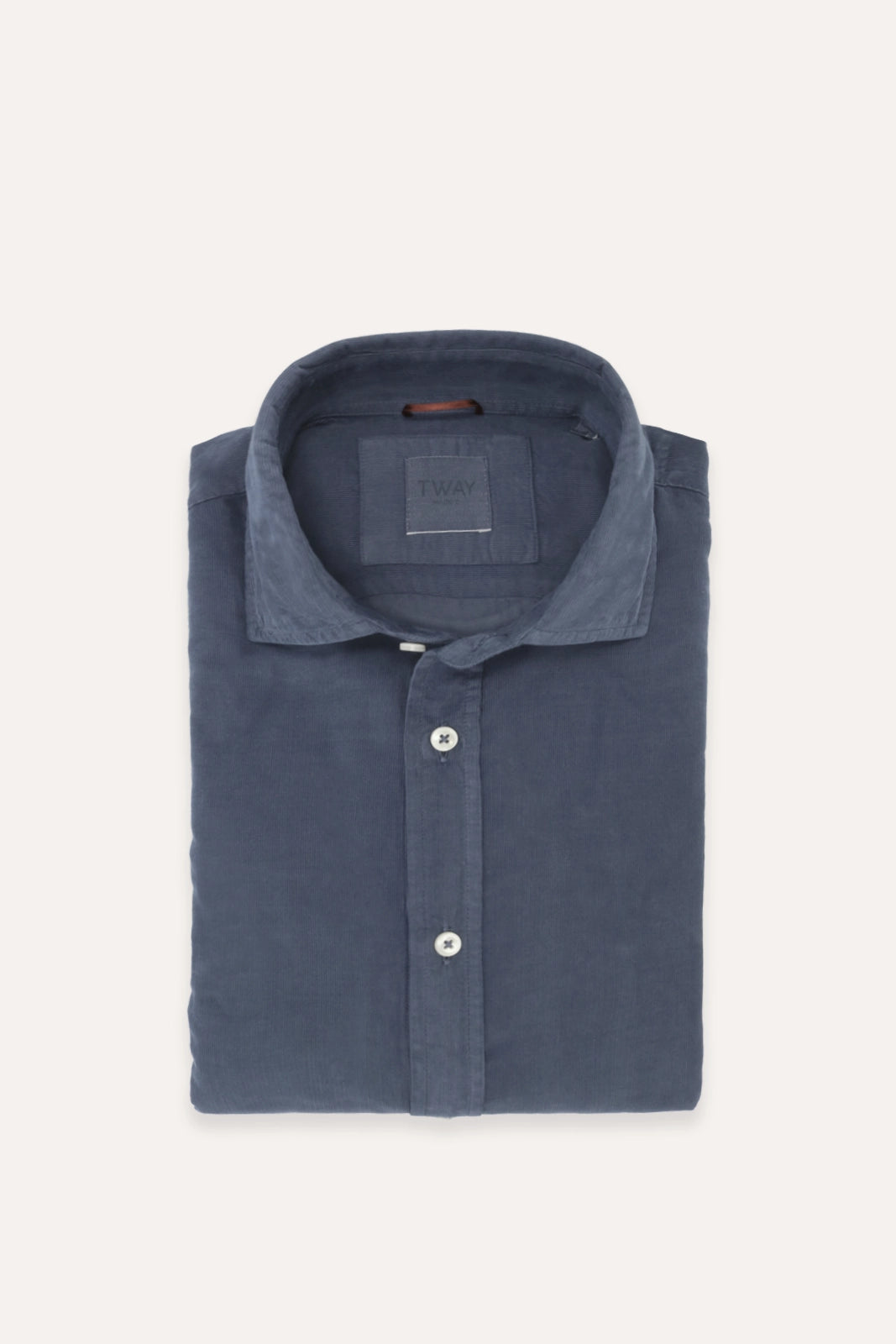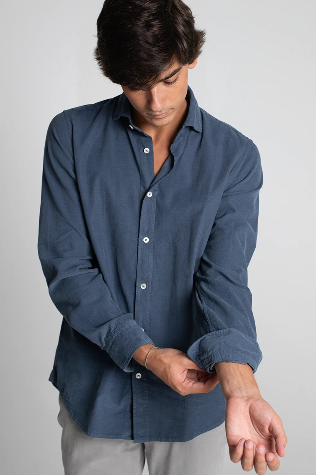 Camisa de micropana en azul oscuro con efecto lavado, con cuello sin botón.