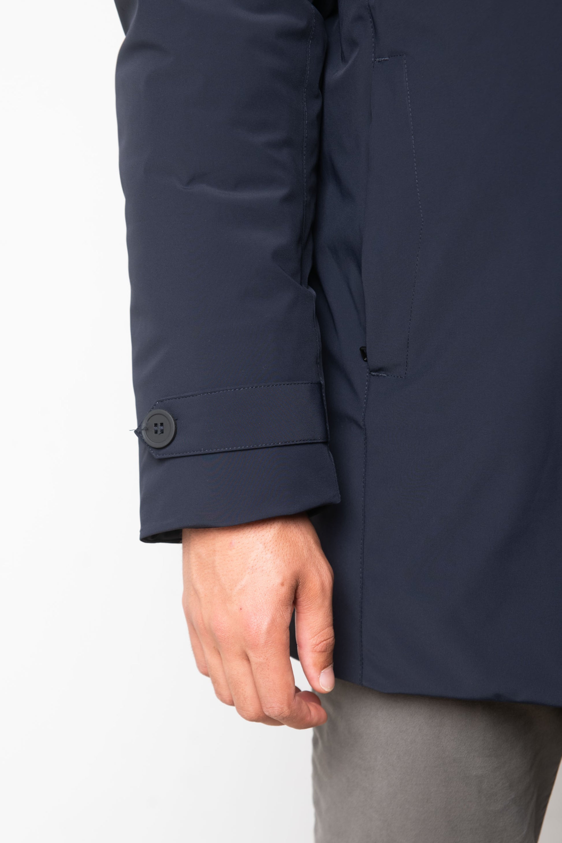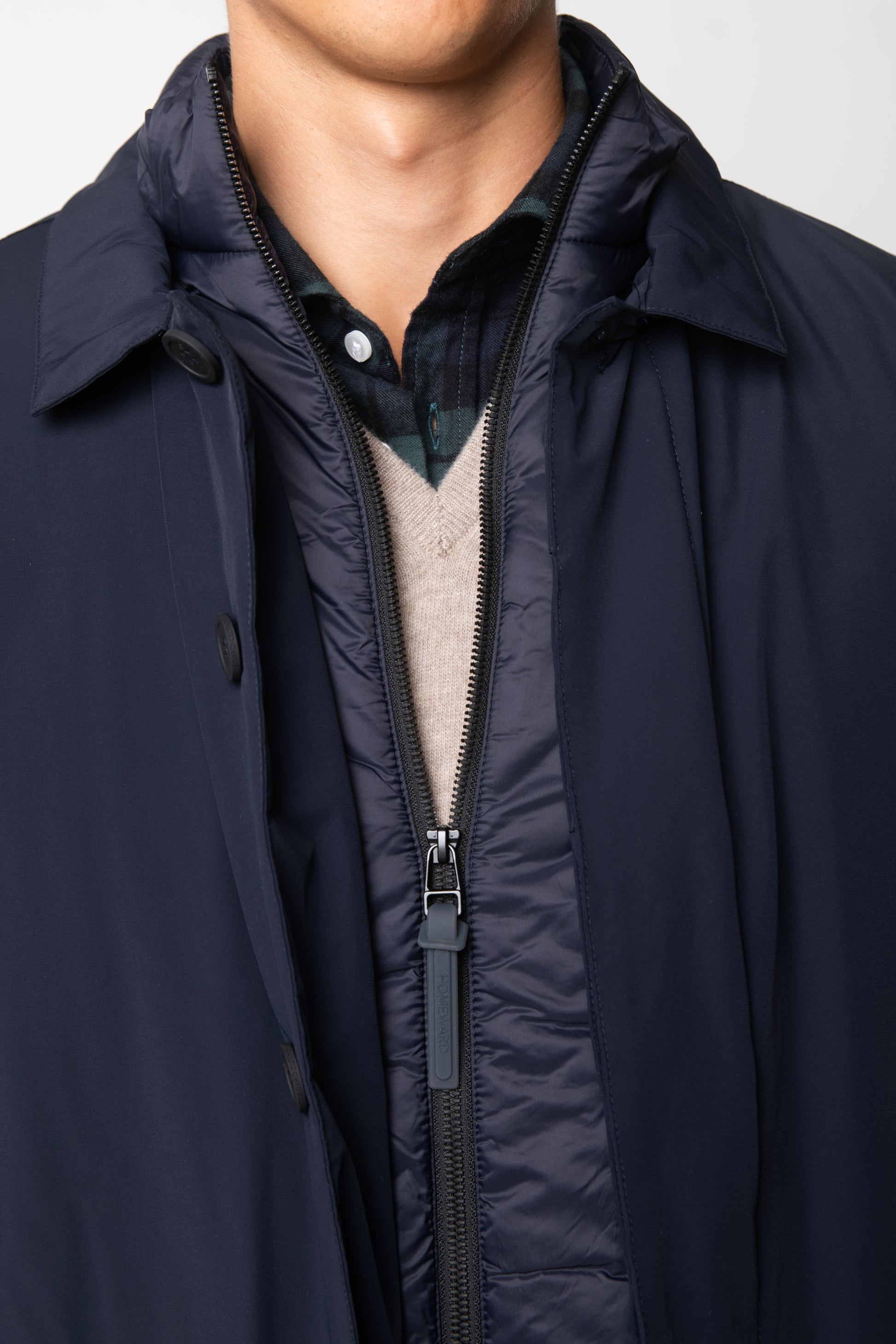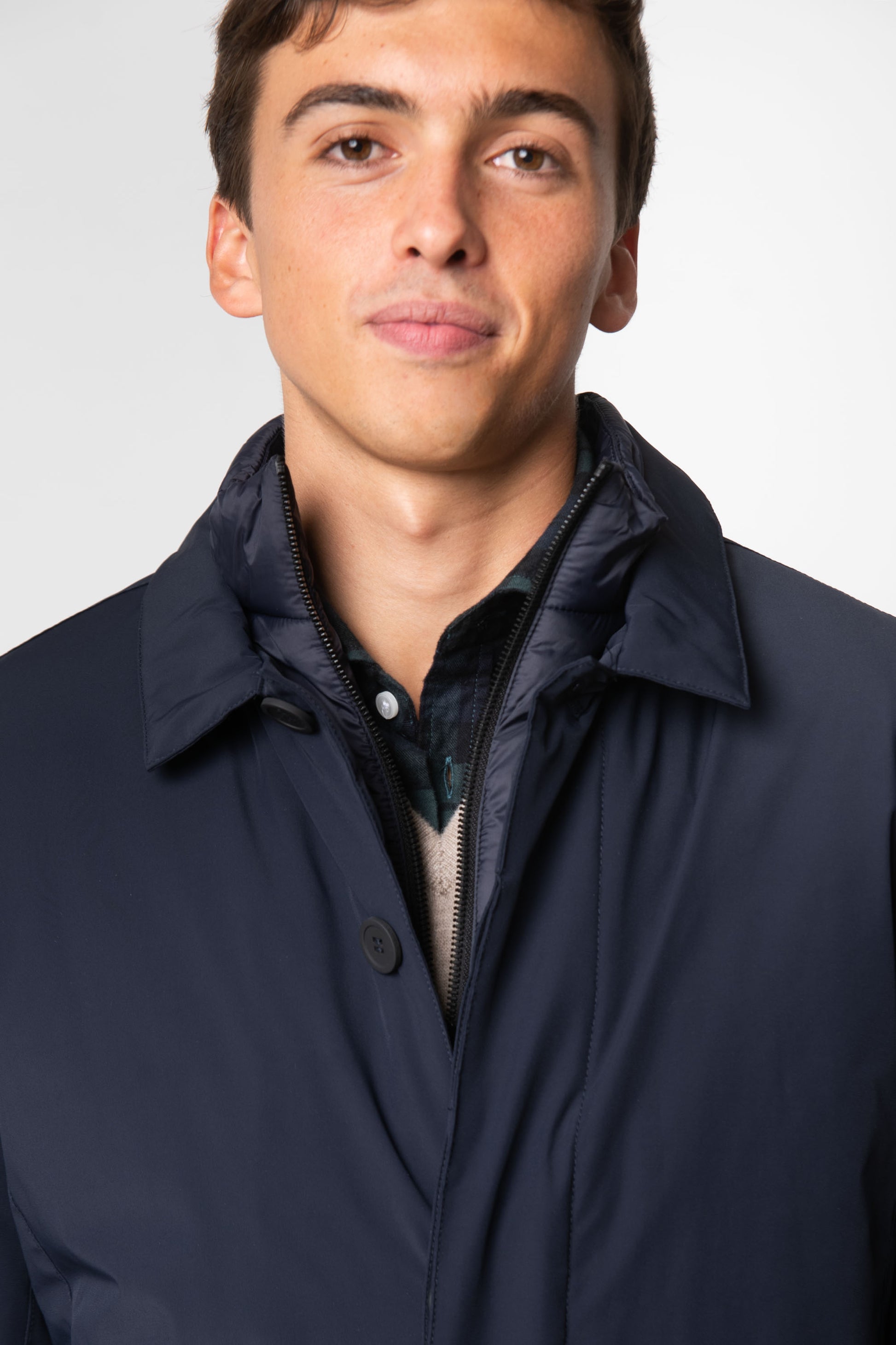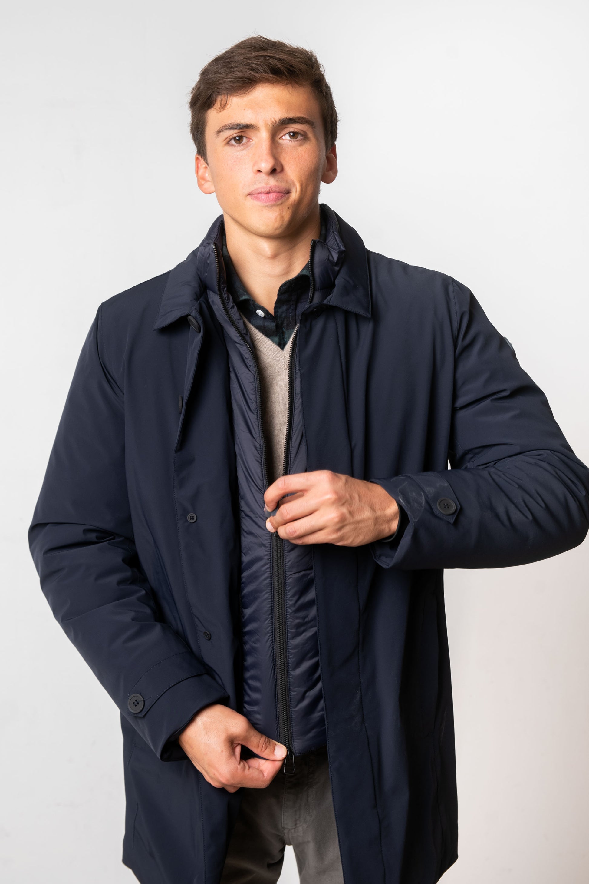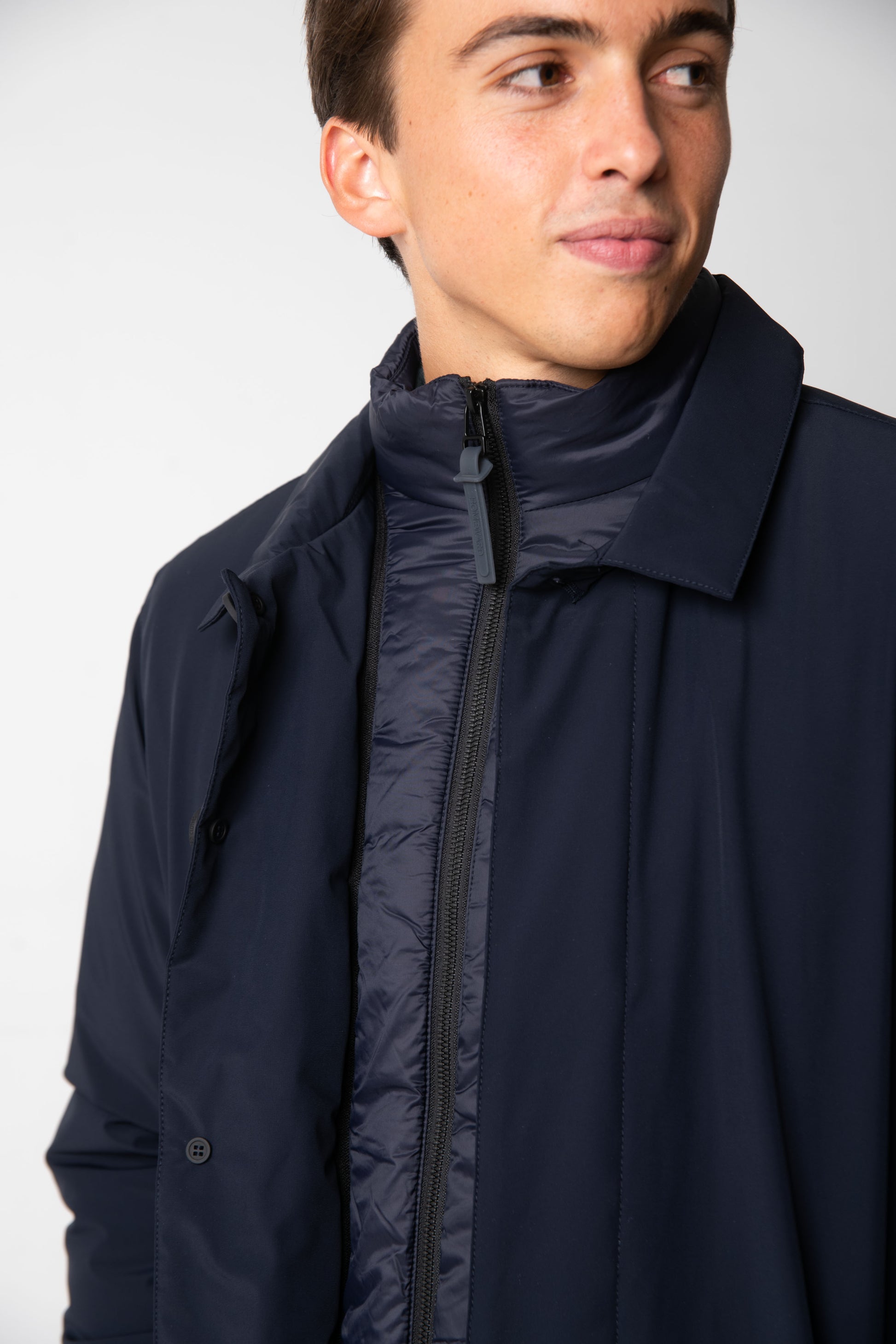 Azul marino, realizada en tejido repelente al agua, es más que una gabardina pues está acolchada por dentro, y tiene la tapeta acolchada desmontable con cremalleras.