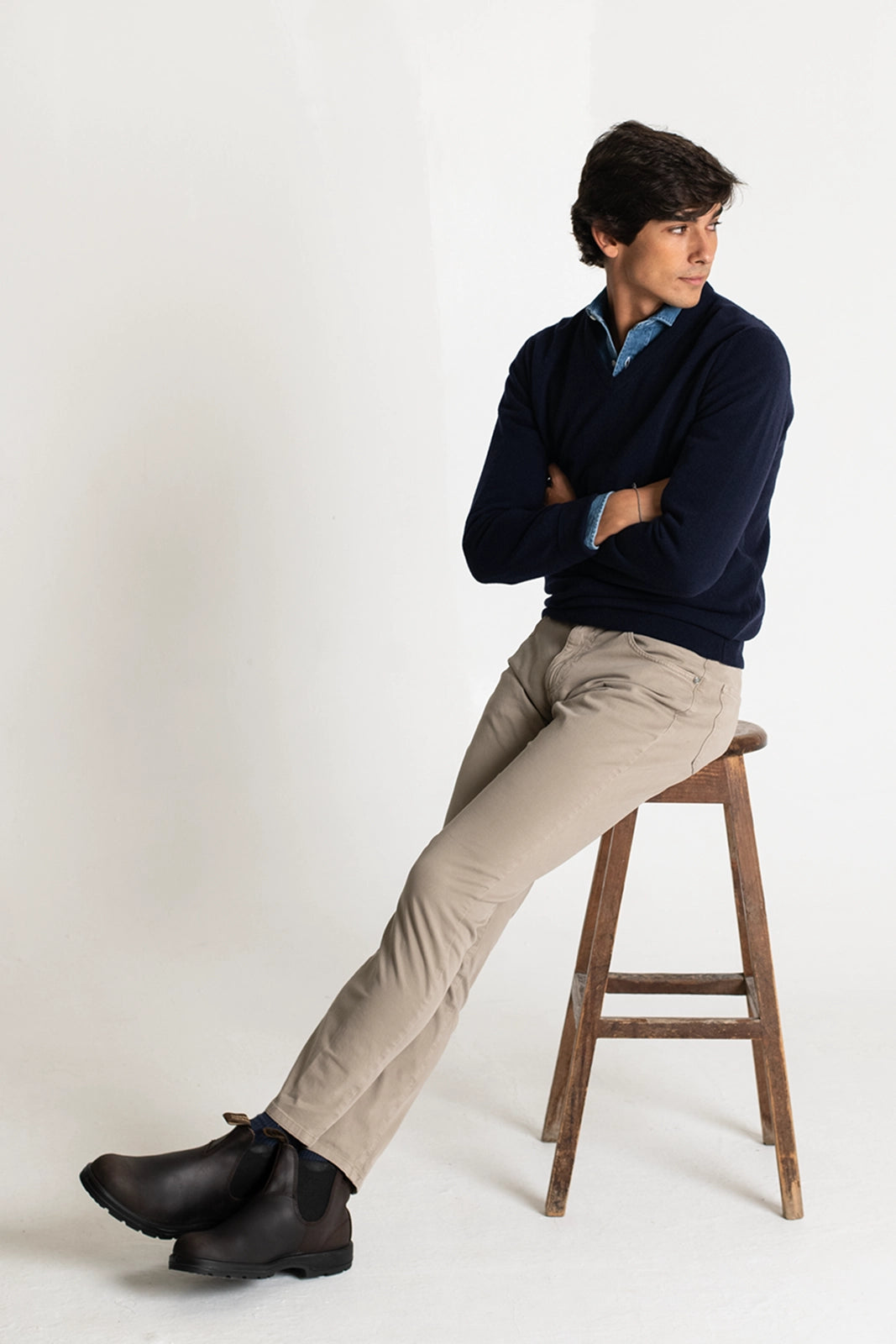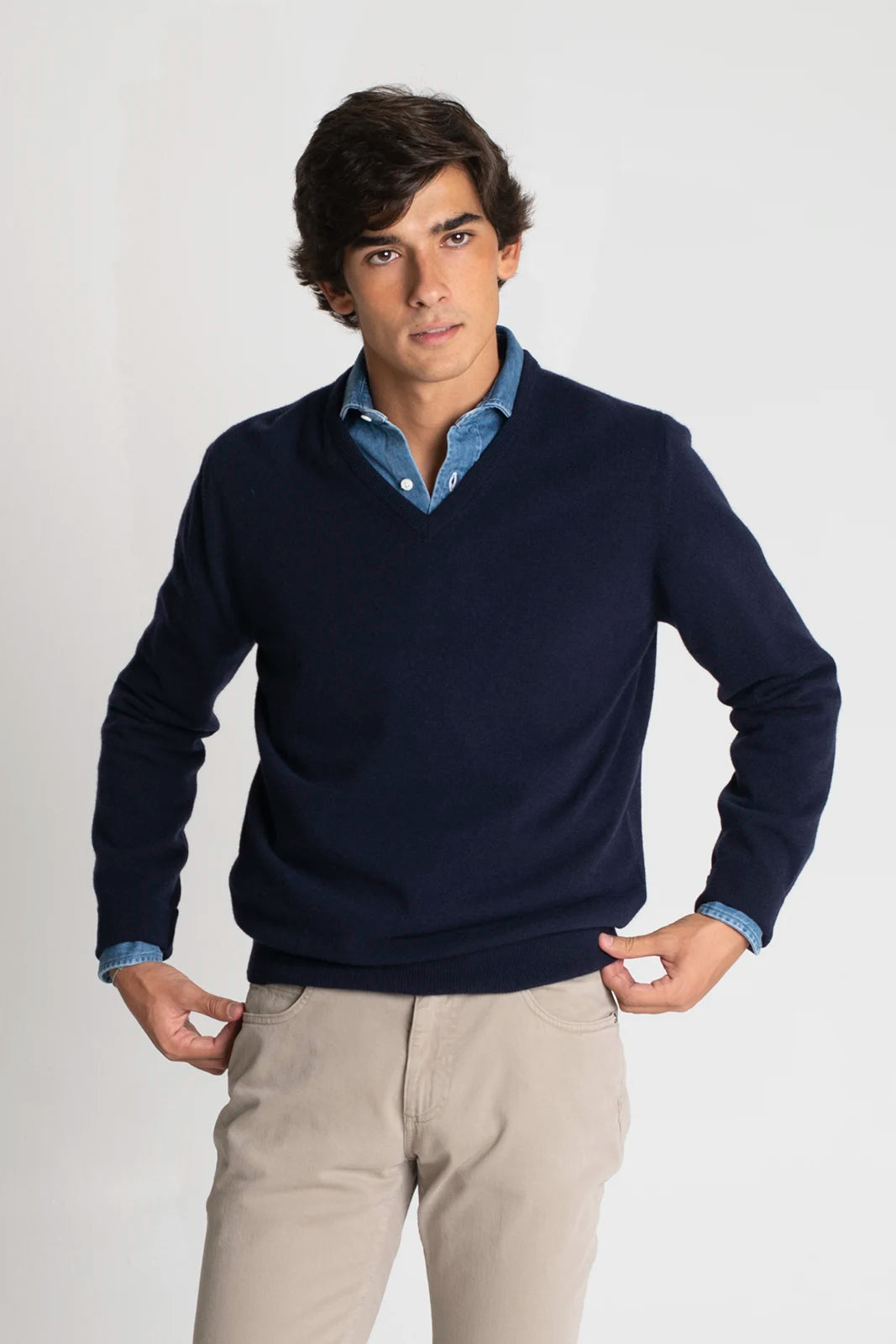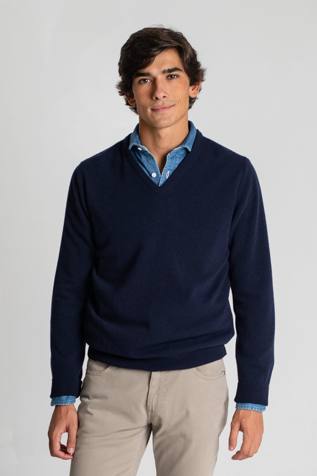 Jersey de lana con cuello en pico de color azul marino, fundamental en todos los armarios.