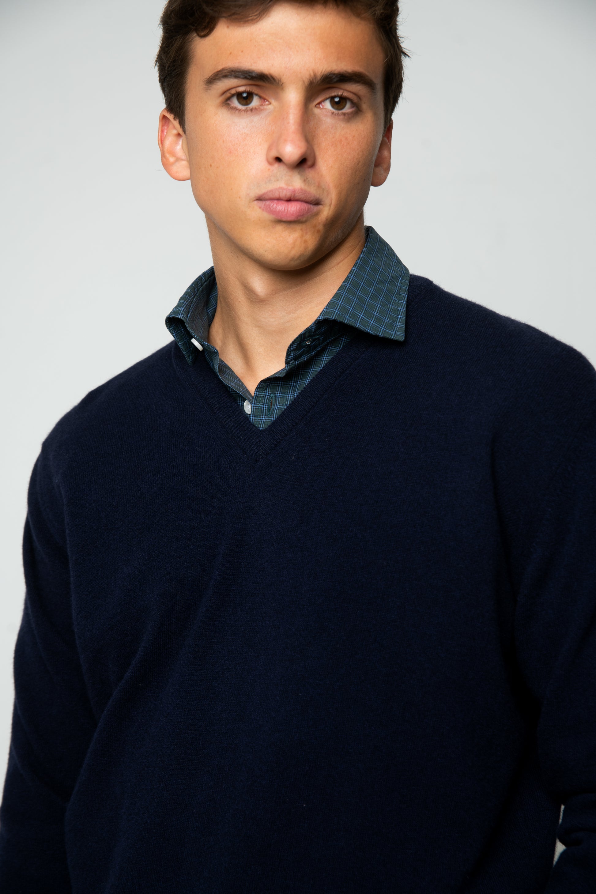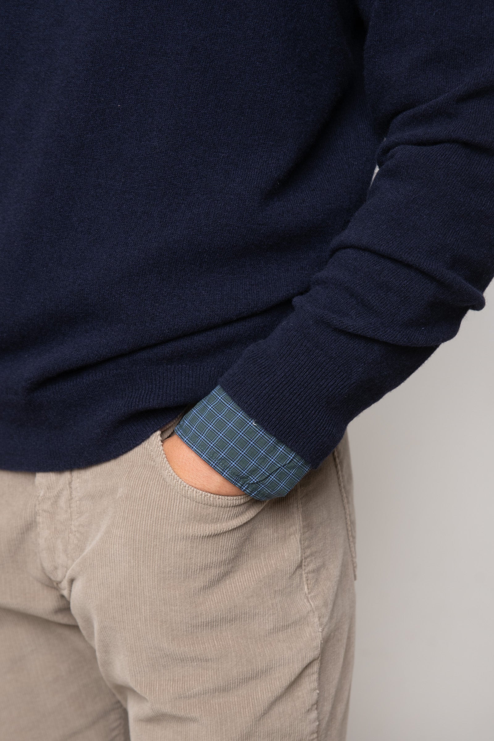 Jersey de lana suave azul marino. El tejido es térmico, absorbe la humedad y aporta una sensación muy confortable. El cuello es de pico y es elástico en la parte de abajo y puños.