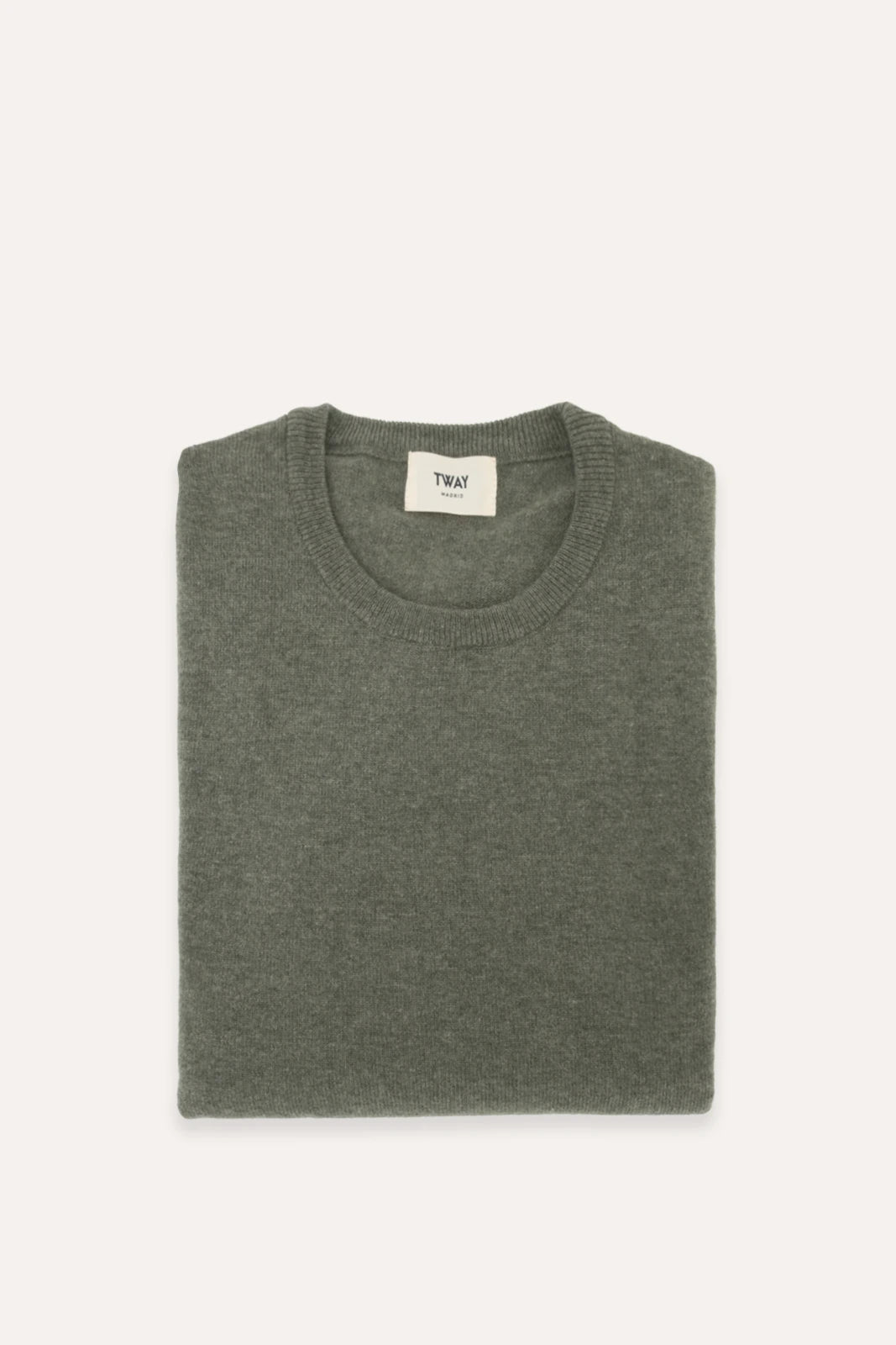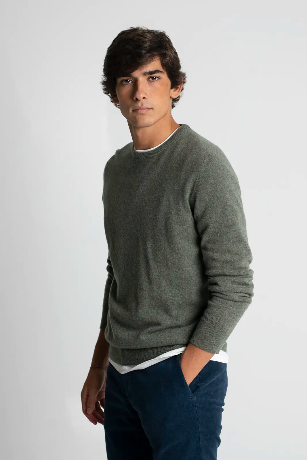 Jersey de lana con cuello redondo de un color verde oliva claro, muy apetecible para el otoño y el invierno.