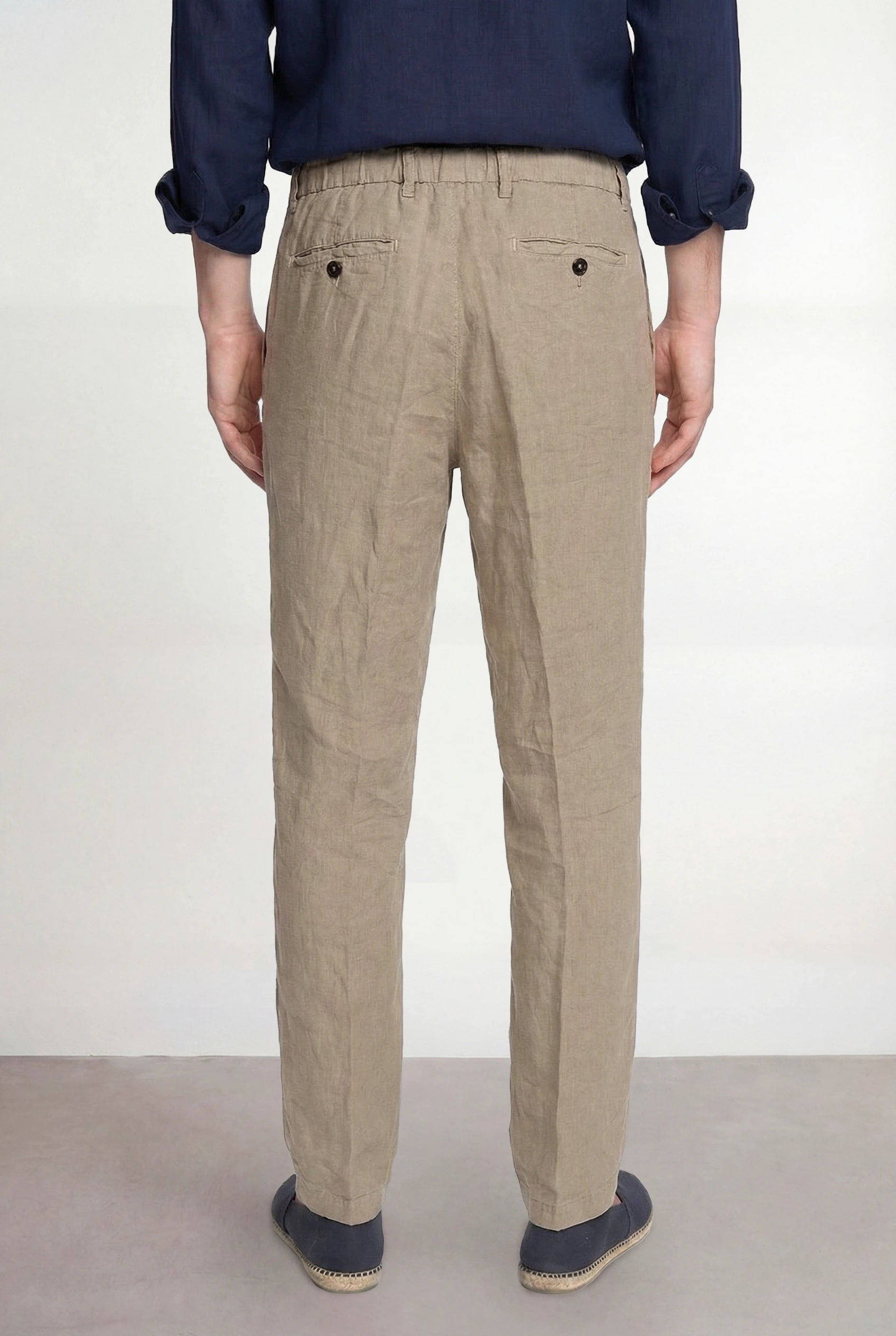 Pantalón chino de un color tostado en un tejido ligero, tipo lino. Confeccionado en tejido ligero y transpirable, ofrece una sensación fresca y natural, ideal para climas cálidos.