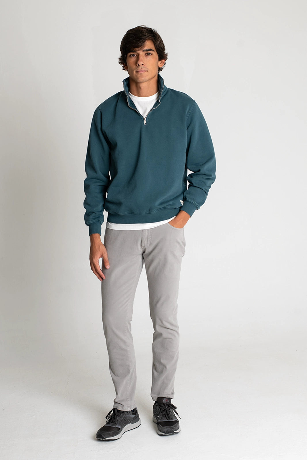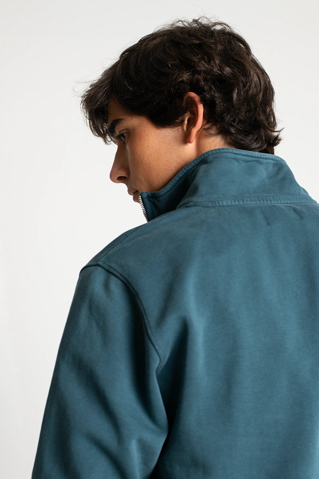 Sudadera con media cremallera y cuello subido, en color azul verdoso. Confeccionada en un algodón muy agradable, que abriga ligeramente sin agobiar.