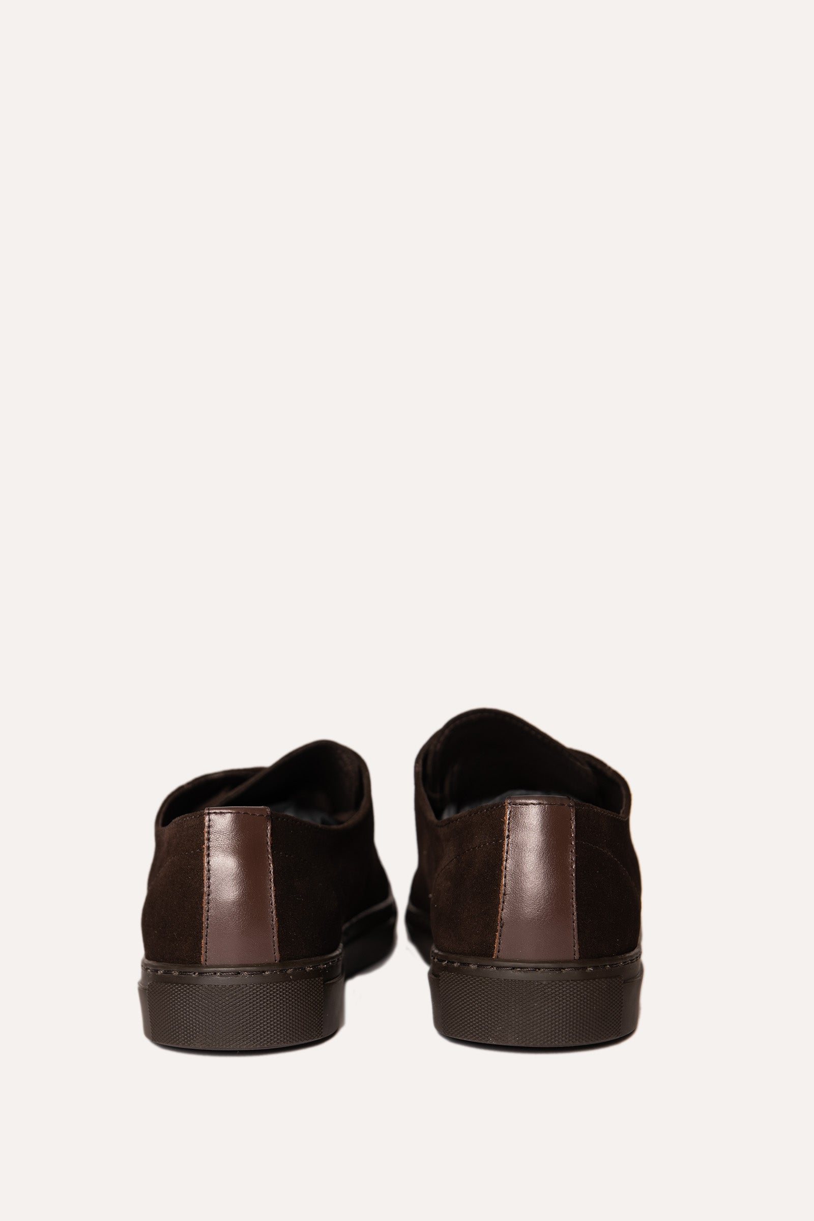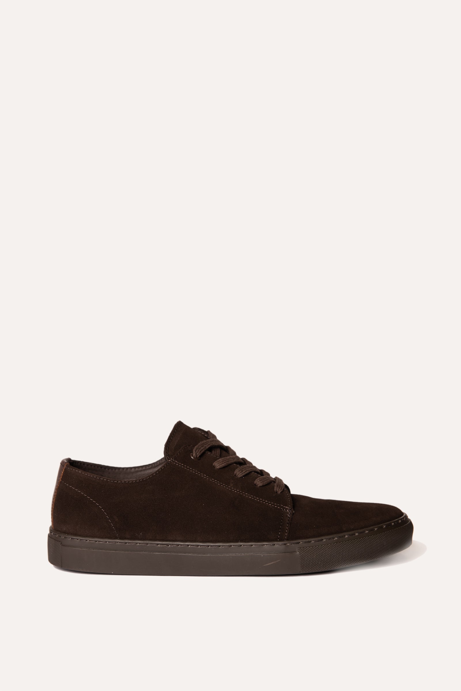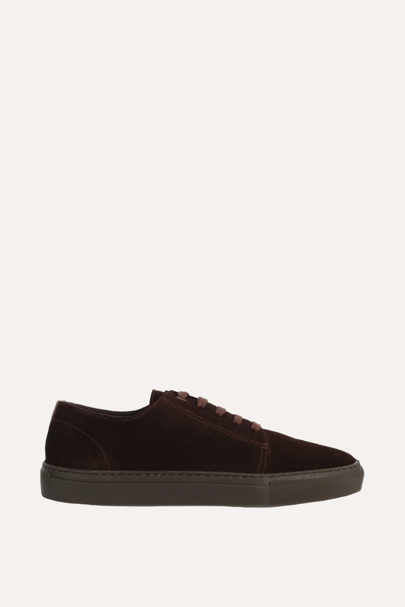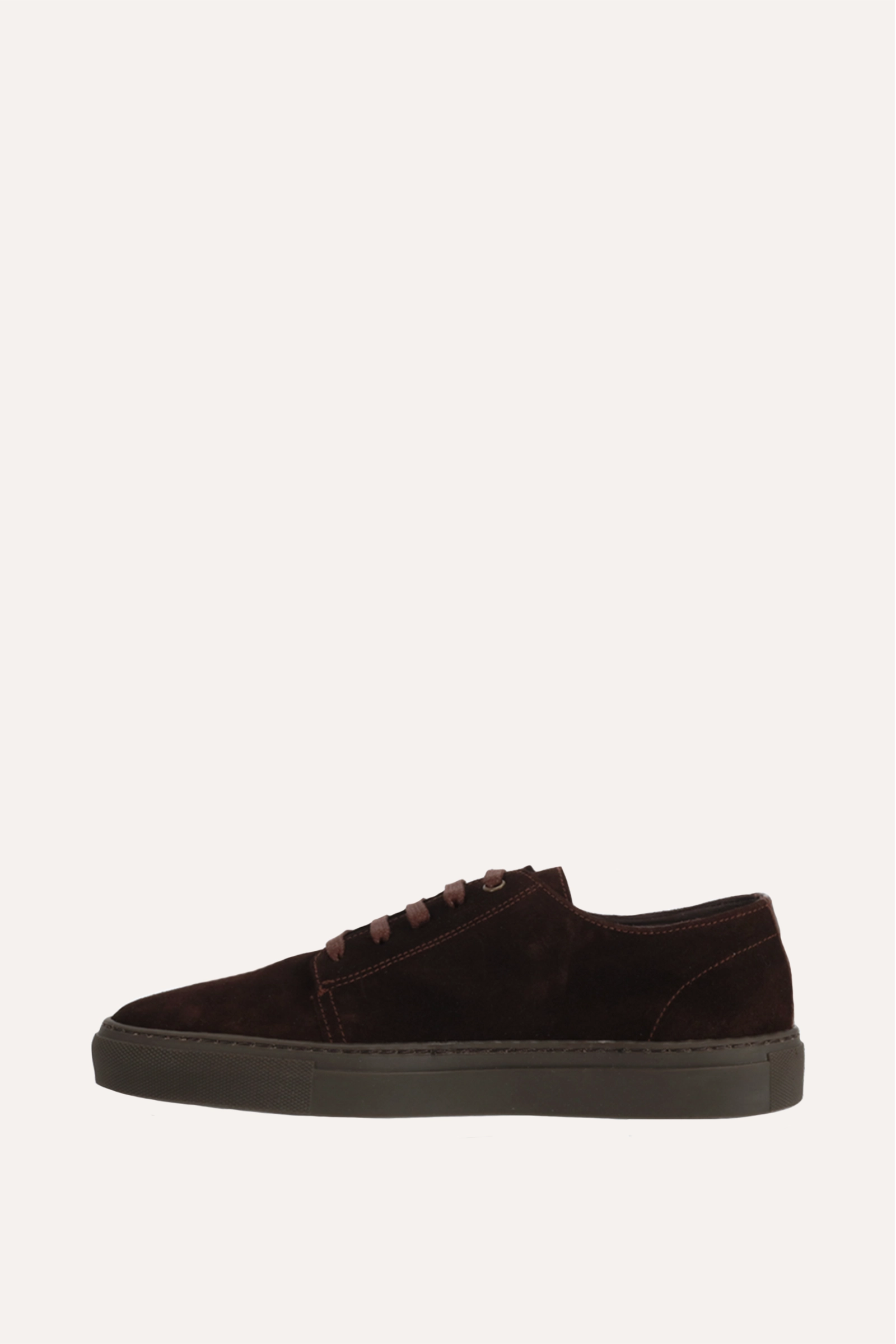 Zapatillas de cordones planos fabricados en España, en serraje marrón oscuro.